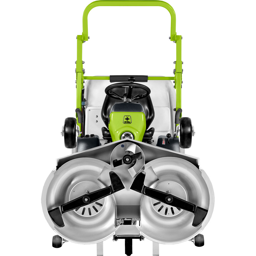 Der Grillo FD 450 ist ein hydrostatischer Frontmäher mit professioneller Sammelleistung und richtet sich an Anwender, die große Flächen schnell, sauber und komfortabel pflegen möchten. Das frontal angeordnete Mähdeck bietet beste Sicht auf die Arbeitsfläche und ermöglicht präzises Mähen unter Sträuchern und tiefen Ästen, wodurch Nacharbeiten deutlich reduziert werden. Das Grillo Overblow-System unterstützt eine besonders zuverlässige Aufnahme, indem der Luft-Gras-Strom im Ladekanal beschleunigt wird und dadurch auch bei feuchtem Gras eine hohe Sammelleistung ohne Verstopfungen erreicht wird. Der große Fangkorb mit Hochentleerung erleichtert die Entsorgung erheblich und erlaubt das komfortable Entleeren auch in höher stehende Behälter oder Fahrzeuge, ohne den Arbeitsplatz zu verlassen. Schnitthöhe, Deckanhebung sowie Korbanhebung und -entleerung lassen sich bequem vom Fahrersitz aus steuern, was den Arbeitsfluss spürbar verbessert. Dank kompakter Bauweise, sehr kleinem Wendekreis und Differentialsperre bleibt die Maschine auch auf engem oder anspruchsvollem Gelände leicht beherrschbar und traktionsstark. Insgesamt kombiniert der FD 450 hohe Flächenleistung mit erstklassigem Schnittbild, starker Aufnahme und einer robusten Konstruktion für den regelmäßigen, professionellen Einsatz.