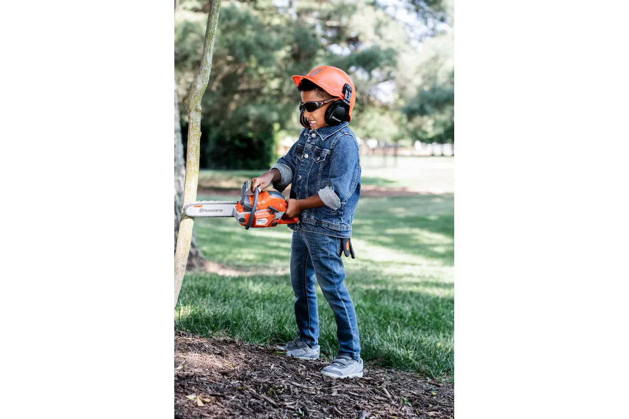Das Spielzeug-Set im Husqvarna 550XP Design kombiniert eine realistisch aussehende Motorsäge mit Schutzausrüstung in Kindergröße: Helm, Handschuhe und Brille. Die Säge bietet Motorsägengeräusch und eine rotierende Kette, sodass Kinder ab 3 Jahren das „Sägen“ spielerisch und mit passendem Zubehör nachahmen können.